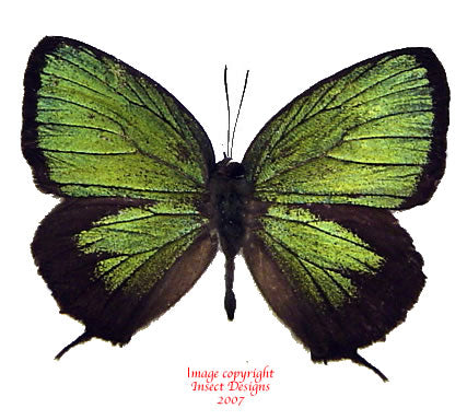 A-: These specimens have minor damage, such as antenna damage, or minor flight wear such as small scratches, minor sale damage, some minor fraying/chipping around the edges of the wings. In the case of beetles, the damage could be minor leg damage, small stains or scratches.