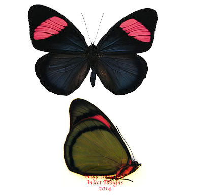 A-: These specimens have minor damage, such as antenna damage, or minor flight wear such as small scratches, minor sale damage, some minor fraying/chipping around the edges of the wings. In the case of beetles, the damage could be minor leg damage, small stains or scratches.