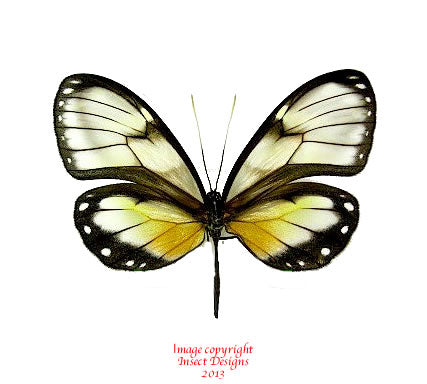A-: These specimens have minor damage, such as antenna damage, or minor flight wear such as small scratches, minor sale damage, some minor fraying/chipping around the edges of the wings. In the case of beetles, the damage could be minor leg damage, small stains or scratches.