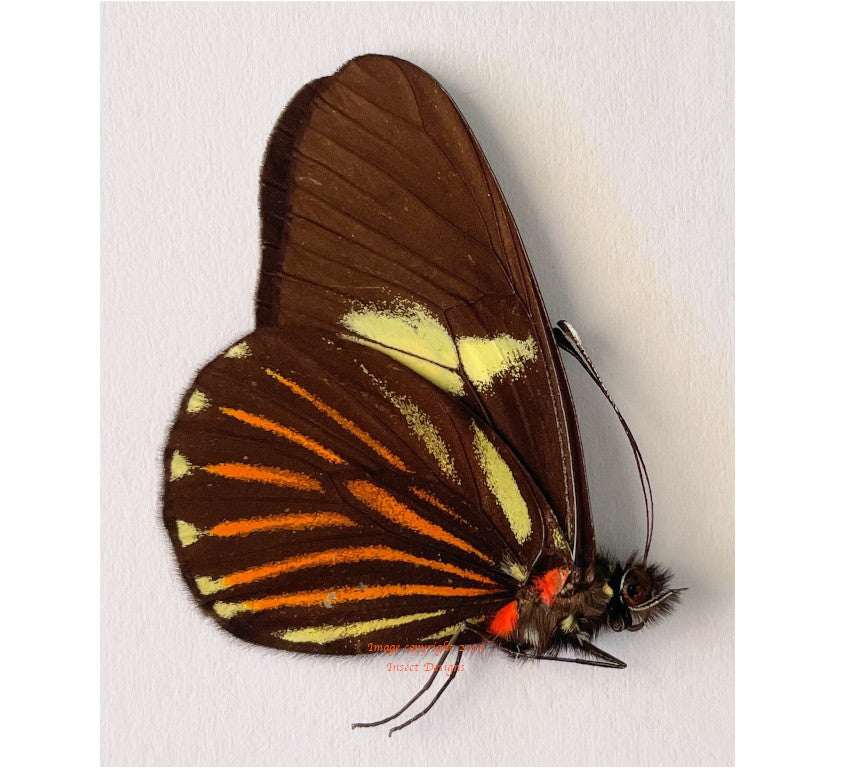 A-: These specimens have minor damage, such as antenna damage, or minor flight wear such as small scratches, minor sale damage, some minor fraying/chipping around the edges of the wings. In the case of beetles, the damage could be minor leg damage, small stains or scratches.