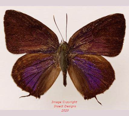 A-: These specimens have minor damage, such as antenna damage, or minor flight wear such as small scratches, minor sale damage, some minor fraying/chipping around the edges of the wings. In the case of beetles, the damage could be minor leg damage, small stains or scratches.